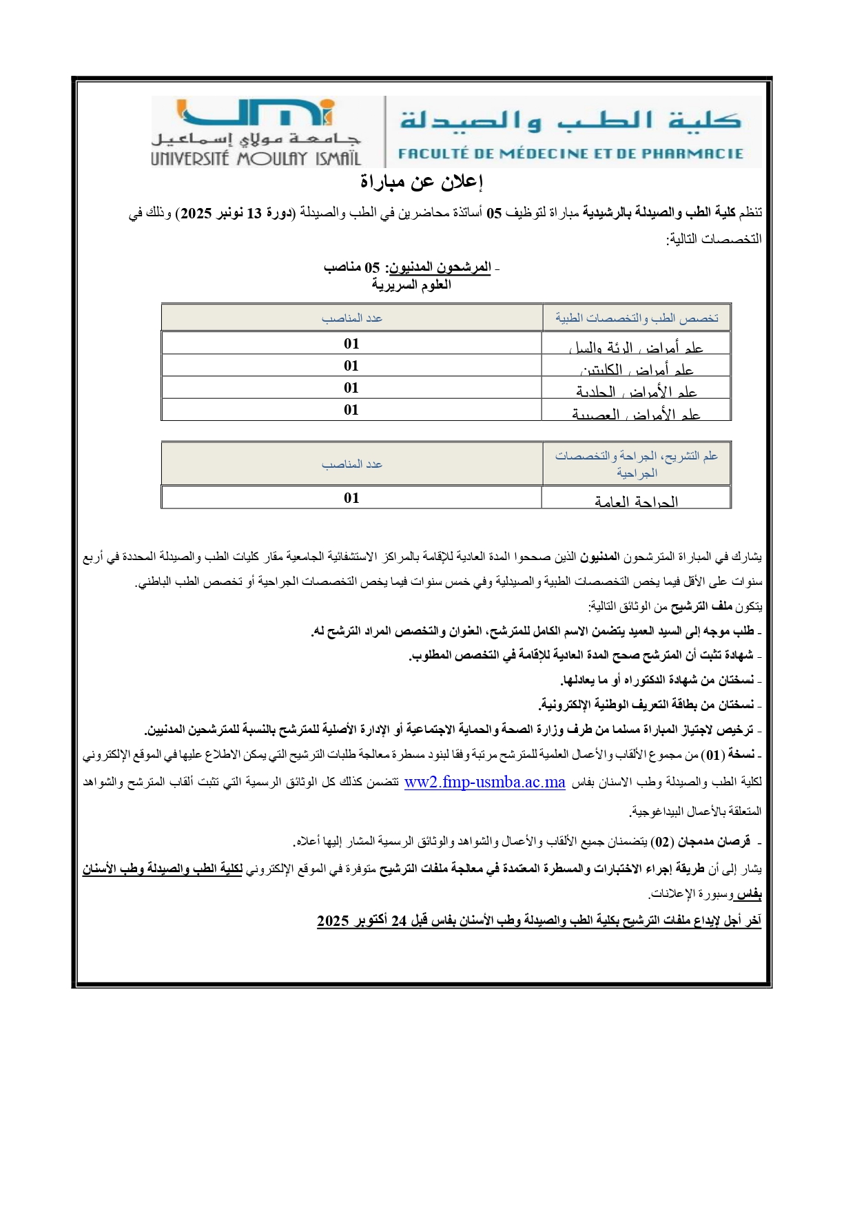 La Faculté de Médecine et de Pharmacie d’Errachidia organise un concours pour le recrutement de cinq Maîtres de conférences (grade A – échelle 11) dans diverses spécialités médicales et chirurgicales. Si vous êtes un professionnel de santé académique, c’est une opportunité exceptionnelle d’intégrer l’enseignement supérieur.