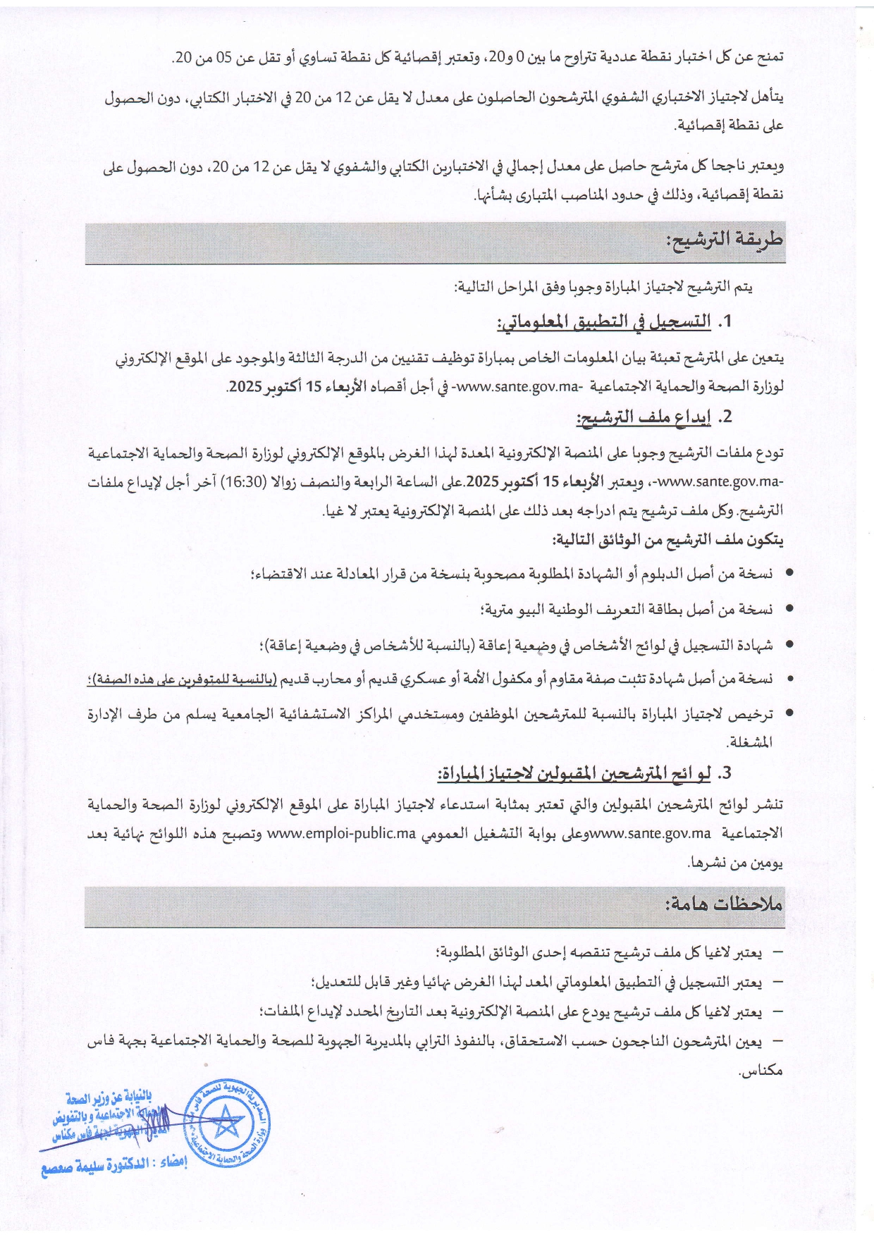 Les candidats intéressés doivent déposer leur candidature uniquement en ligne via le portail officiel du Ministère de la Santé, et ce, au plus tard le 15 Octobre 2025 à 16h30.