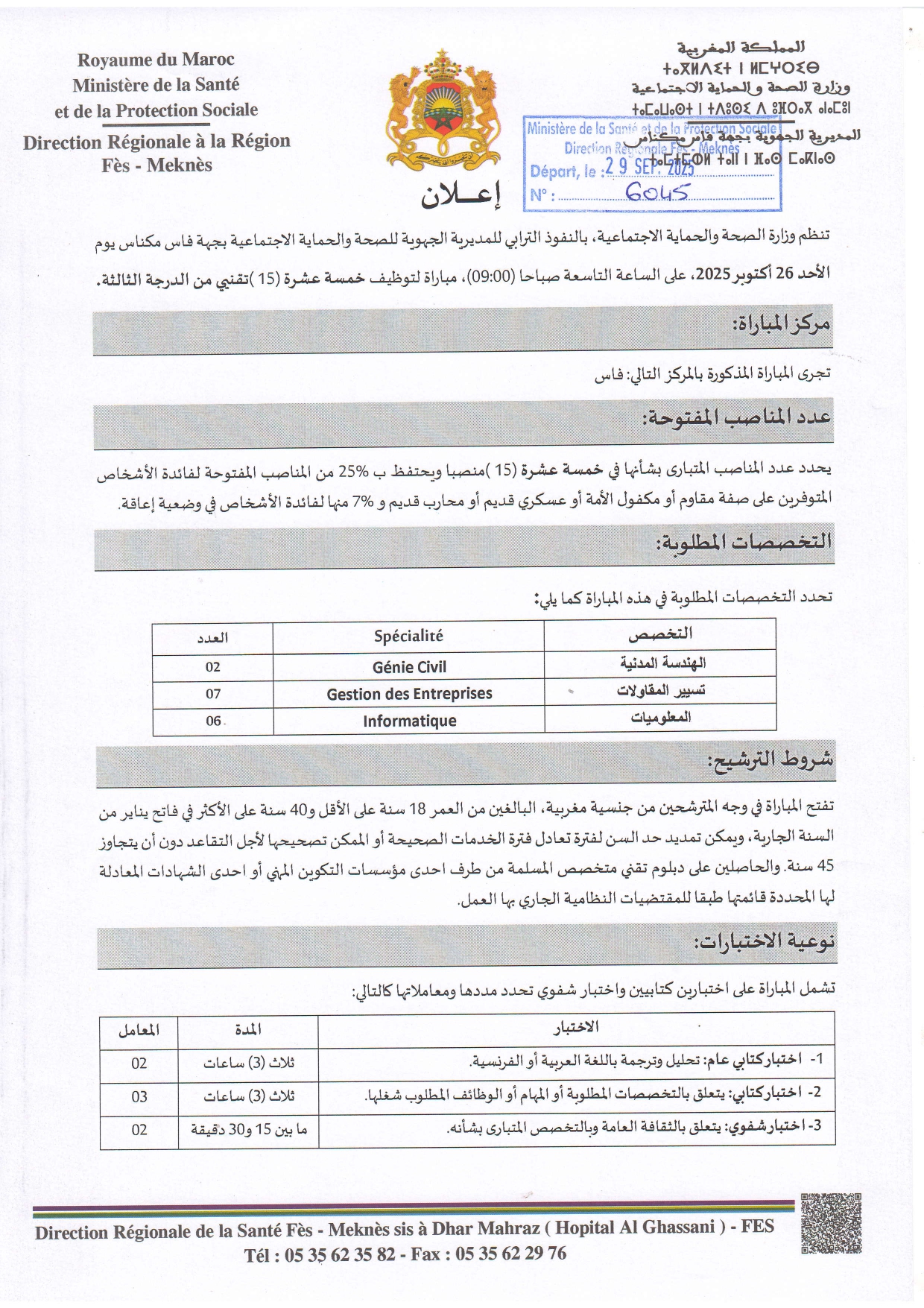 Vous souhaitez mettre vos compétences techniques au service de l’intérêt général ? Le concours pour le recrutement de Technicien de 3ème grade – échelle 9 au Ministère de la Santé et de la Protection Sociale est fait pour vous. Avec 15 postes à pourvoir dans la région de Fès-Meknès, c’est l’opportunité de bâtir une carrière stable et engagée au cœur des enjeux de santé publique. Postulez en ligne avant le 15 octobre 2025 et rejoignez une administration essentielle au service des citoyens.