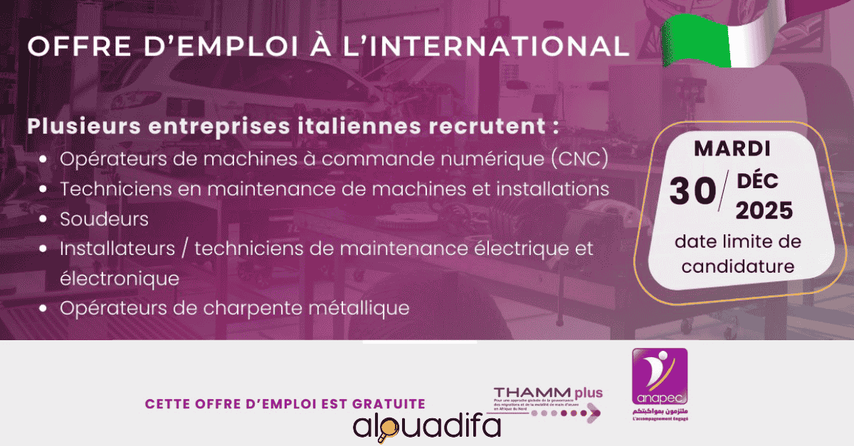 Une opportunité de carrière internationale se présente pour les profils techniques. Le programme THAMM Plus, en partenariat avec l’OIM, recrute actuellement pour le compte d’entreprises italiennes à la recherche de main-d’œuvre qualifiée. Cette offre d’emploi Italie est une chance unique de rejoindre le marché du travail européen avec un accompagnement complet. Pour mettre toutes les chances de votre côté, consultez nos guides pour créer un CV efficace et rédiger une lettre de motivation persuasive.