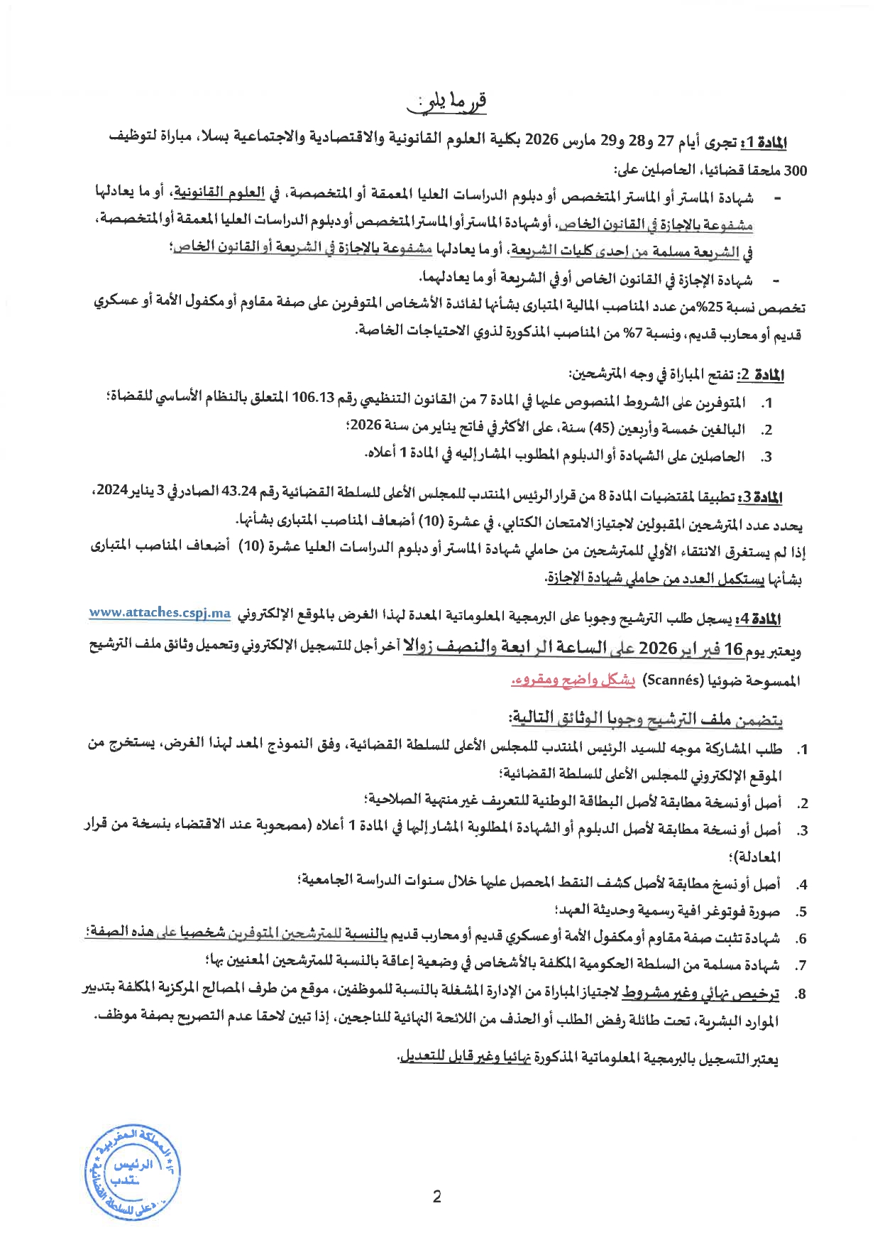 Le Conseil Supérieur du Pouvoir Judiciaire (CSPJ) organise un concours de recrutement d’Attaché de Justice pour pourvoir 300 postes à l’échelle 10. Ce concours s’inscrit dans le cadre des mesures visant à renforcer l’indépendance de la justice marocaine. Les candidats intéressés doivent déposer leur candidature en ligne avant le 16 février 2025. Les épreuves se dérouleront le 27 mars 2025.