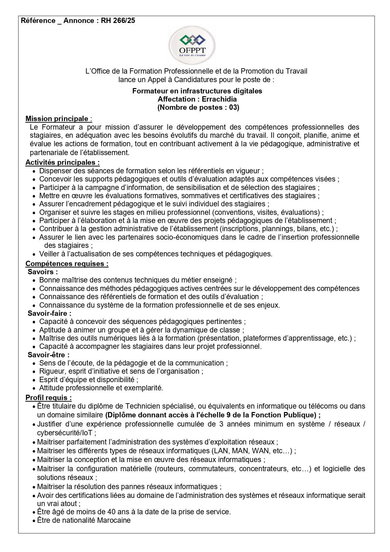 L’Office de la Formation Professionnelle et de la Promotion du Travail (OFPPT) lance deux concours pour le recrutement de 6 formateurs en Infrastructures Digitales à Errachidia :