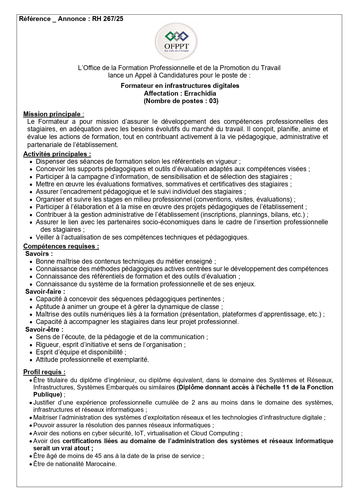 L’Office de la Formation Professionnelle et de la Promotion du Travail (OFPPT) lance deux concours pour le recrutement de 6 formateurs en Infrastructures Digitales à Errachidia :