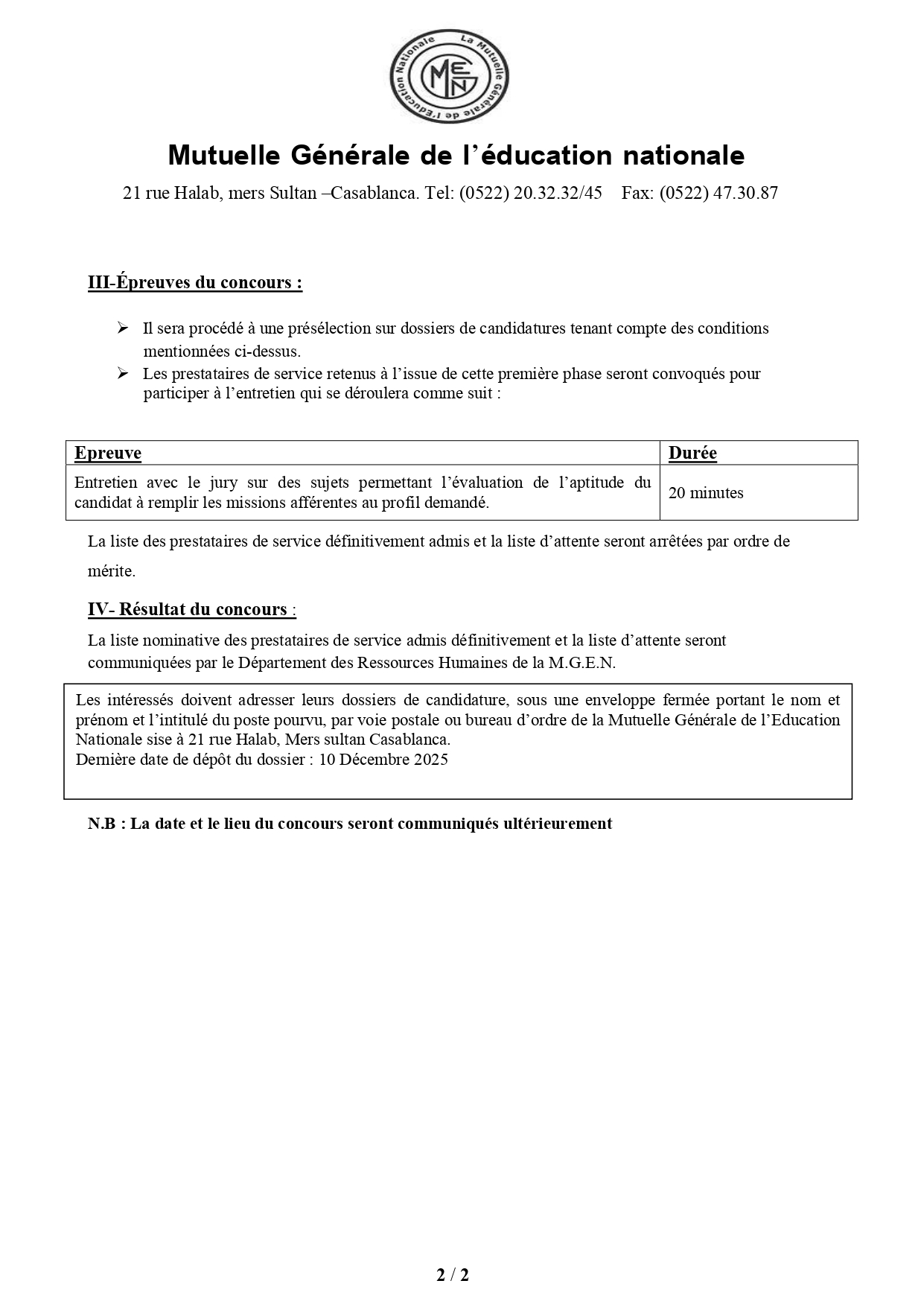 La liste nominative des candidats admis au poste de prestataire de service sera communiquée par le Département des Ressources Humaines de la MGEN. Veuillez noter que la date et le lieu précis de déroulement de l’entretien seront communiqués ultérieurement aux candidats présélectionnés.