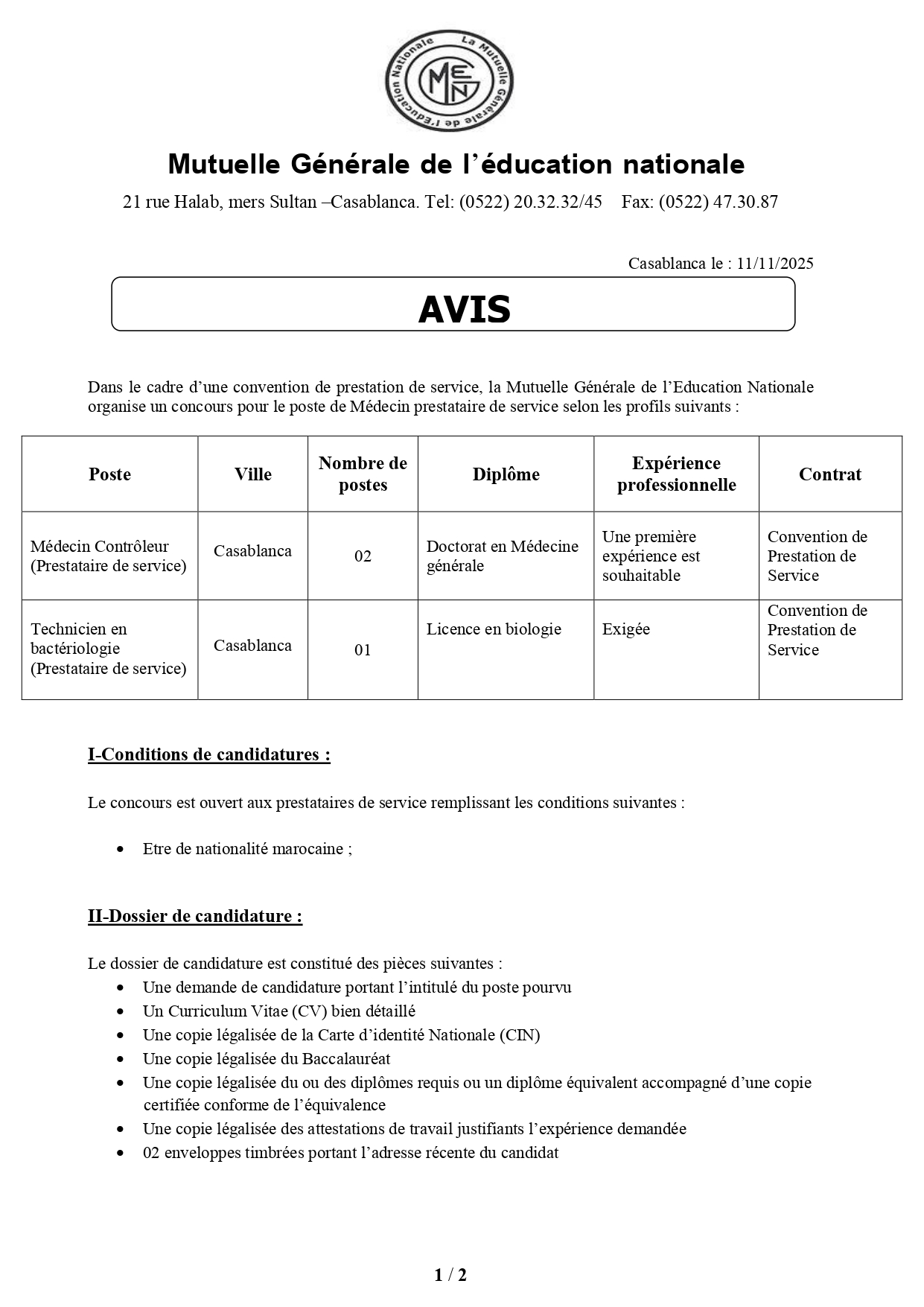 La liste nominative des candidats admis au poste de prestataire de service sera communiquée par le Département des Ressources Humaines de la MGEN. Veuillez noter que la date et le lieu précis de déroulement de l’entretien seront communiqués ultérieurement aux candidats présélectionnés.