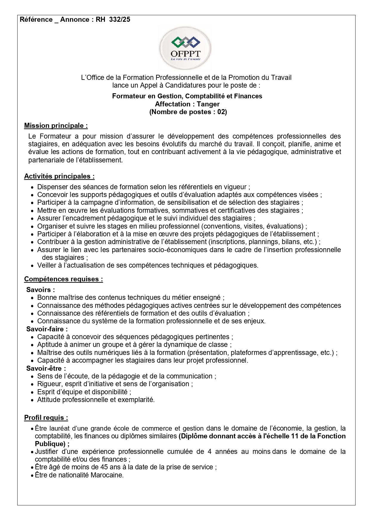 1. Formateur en Gestion, Comptabilité et Finances (2 postes)