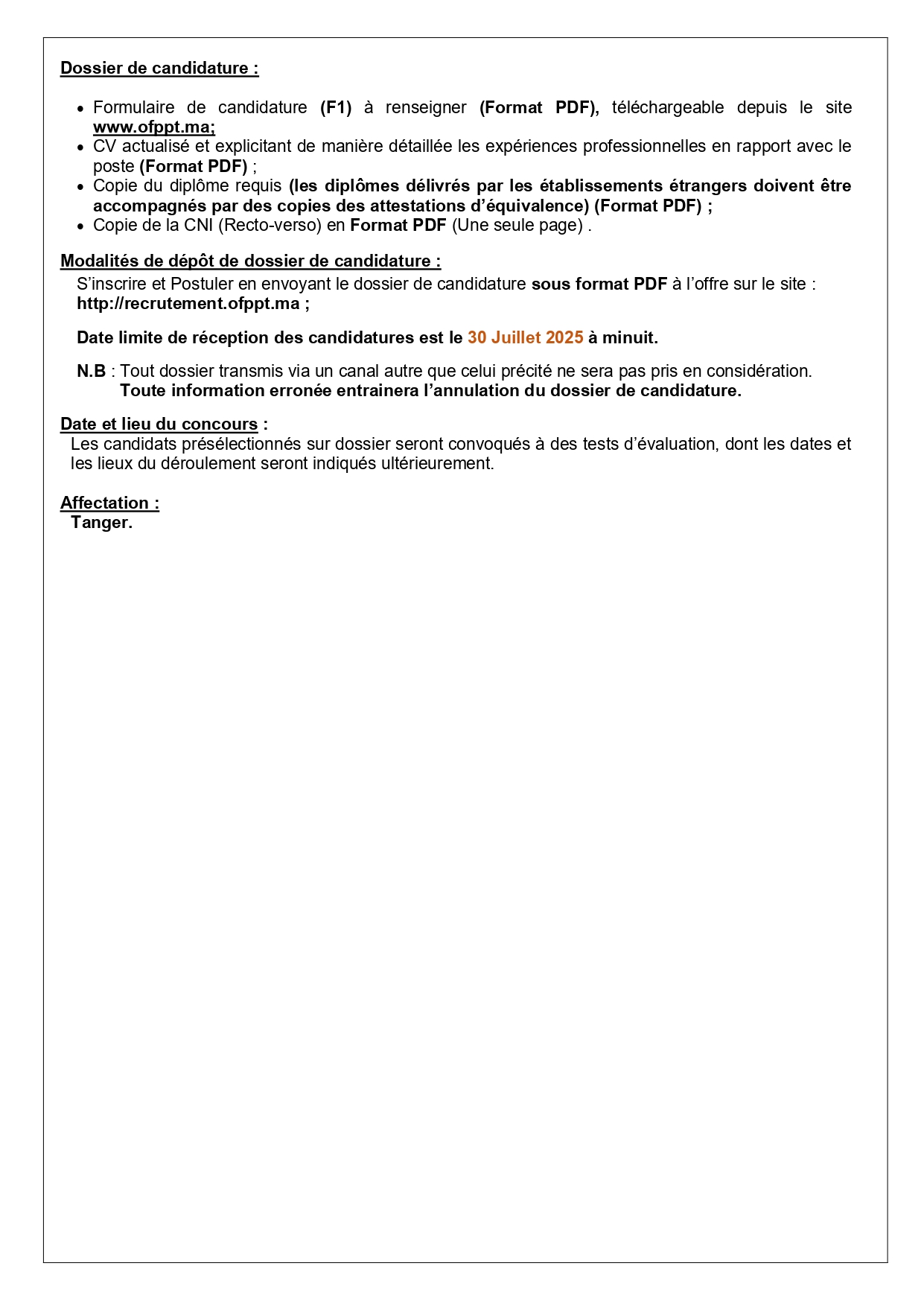 L’Office de la Formation Professionnelle et de la Promotion du Travail (OFPPT) lance un appel à candidatures pour 9 postes de formateurs à Tanger. Si vous avez une expertise en gestion-comptabilité, électronique/robotique ou enseignement du français, voici votre chance de contribuer à l’avenir professionnel des jeunes marocains !