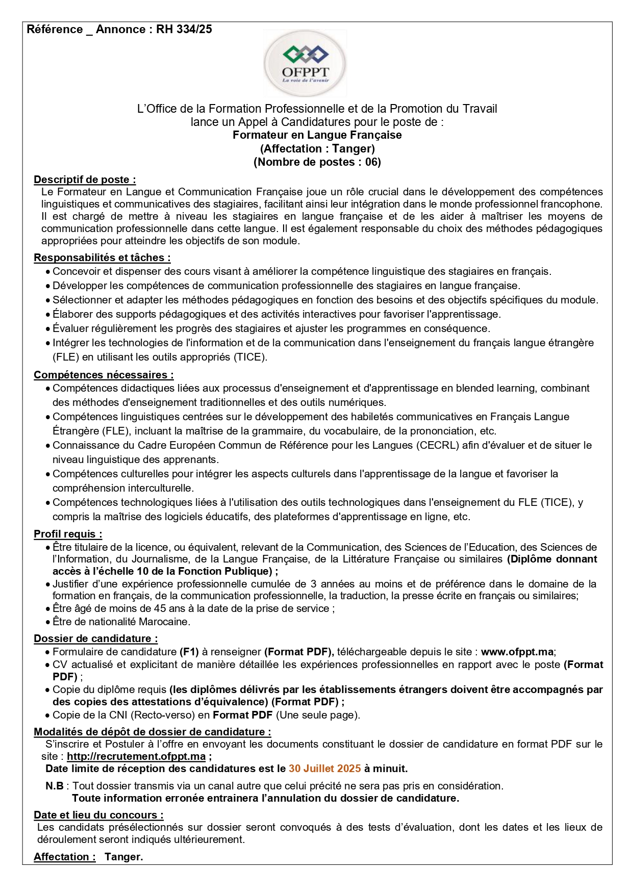 L’Office de la Formation Professionnelle et de la Promotion du Travail (OFPPT) lance un appel à candidatures pour 9 postes de formateurs à Tanger. Si vous avez une expertise en gestion-comptabilité, électronique/robotique ou enseignement du français, voici votre chance de contribuer à l’avenir professionnel des jeunes marocains !