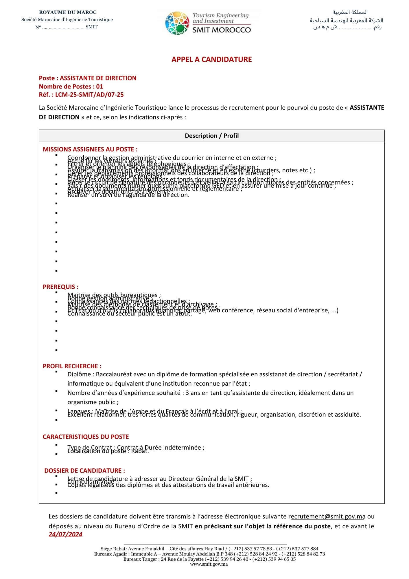 Adresse d’envoi : recrutement@smit.gov.ma