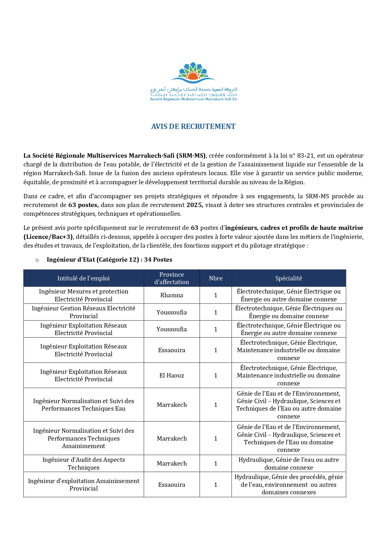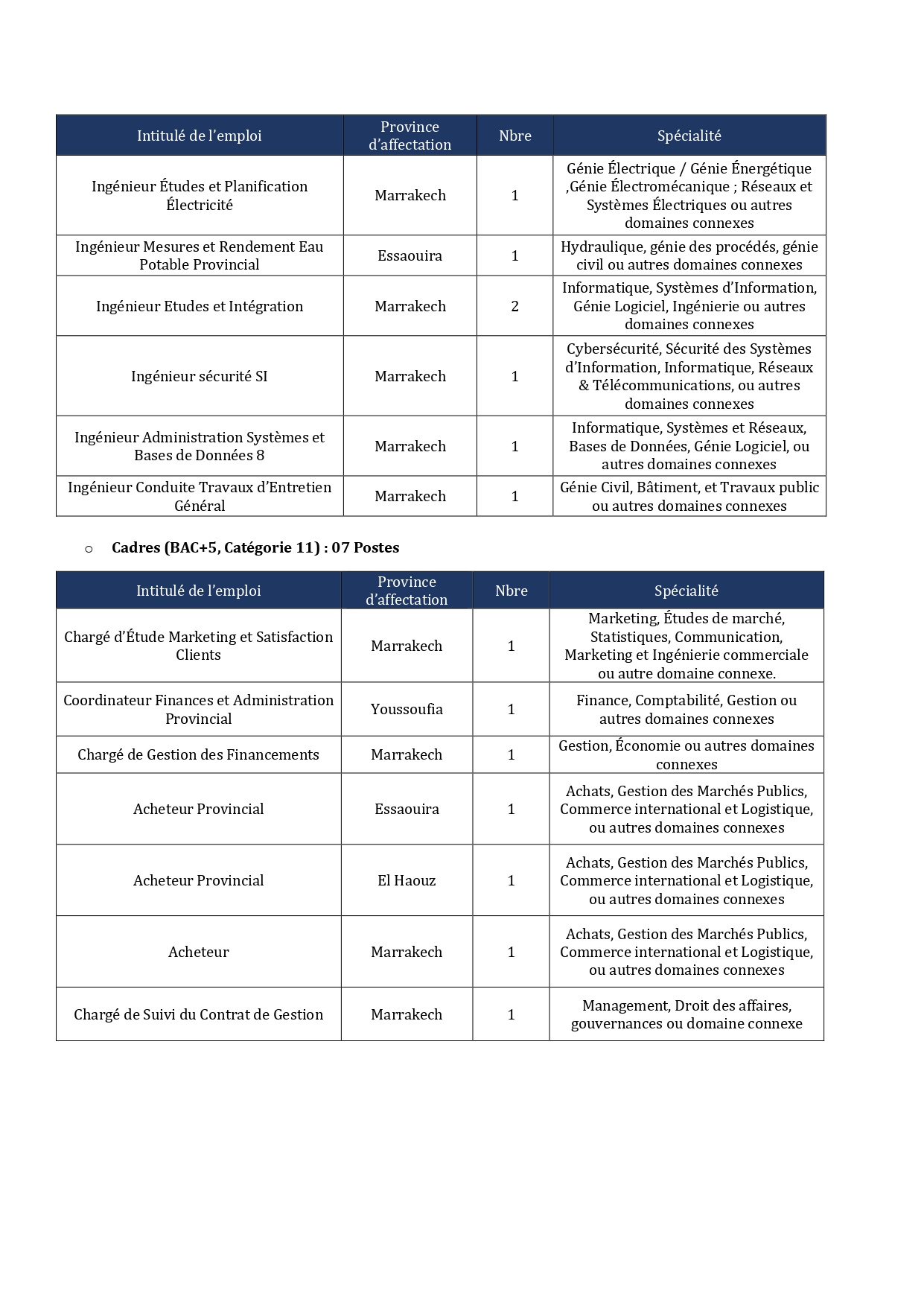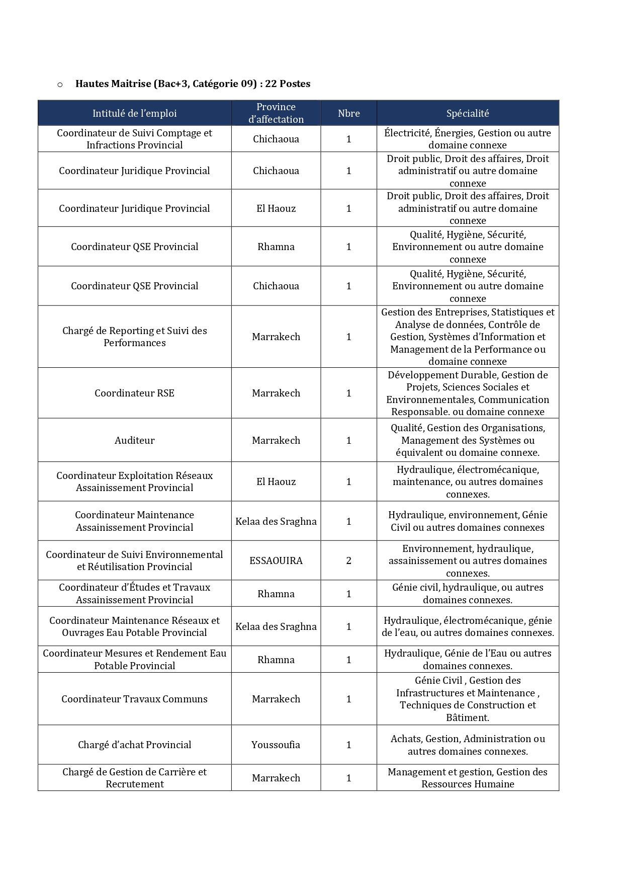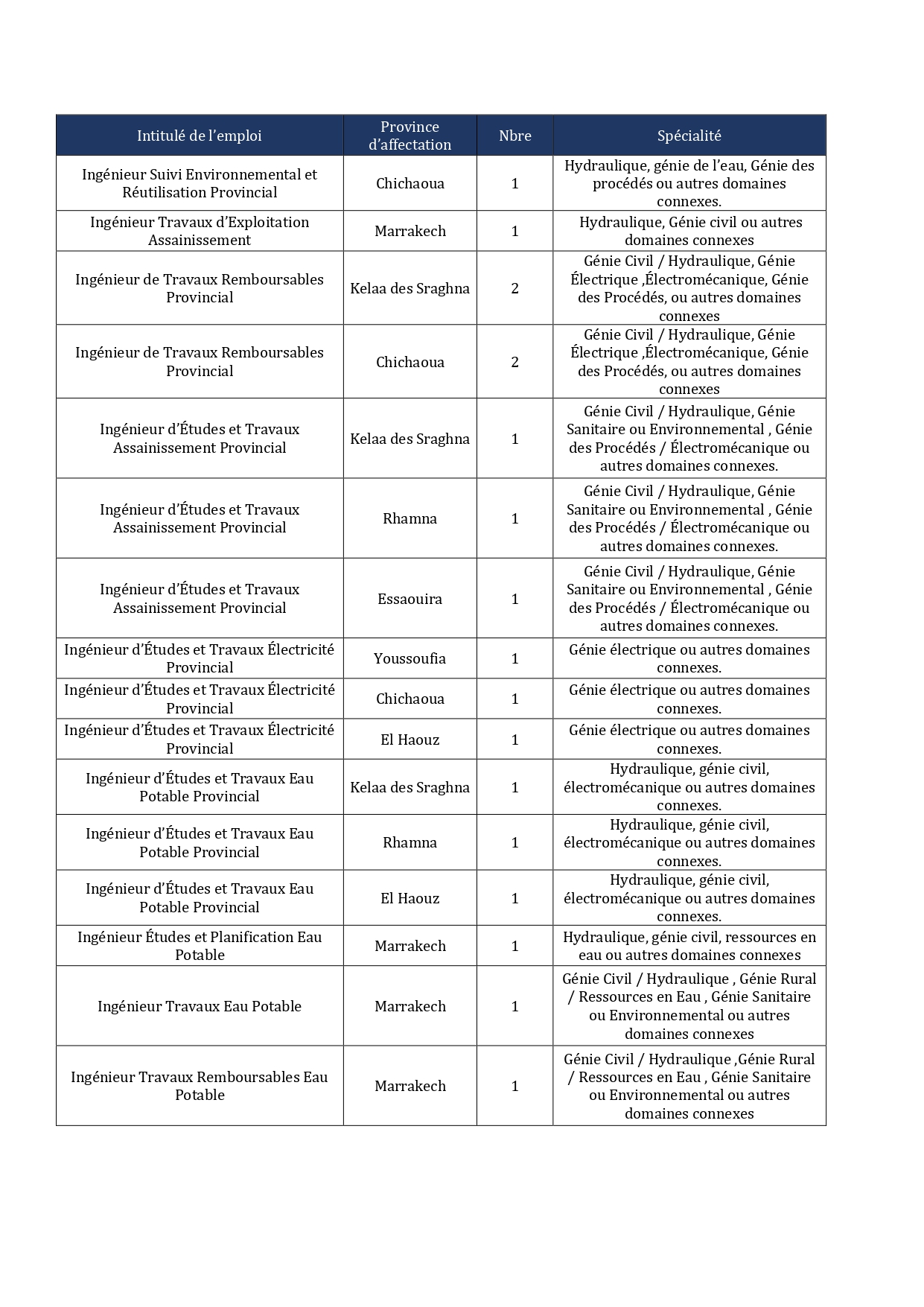 - Hydraulique et génie de l’eau : Postes à Marrakech, Essaouira, Kelaa des Sraghna, Rhamna, El Haouz et Chichaoua