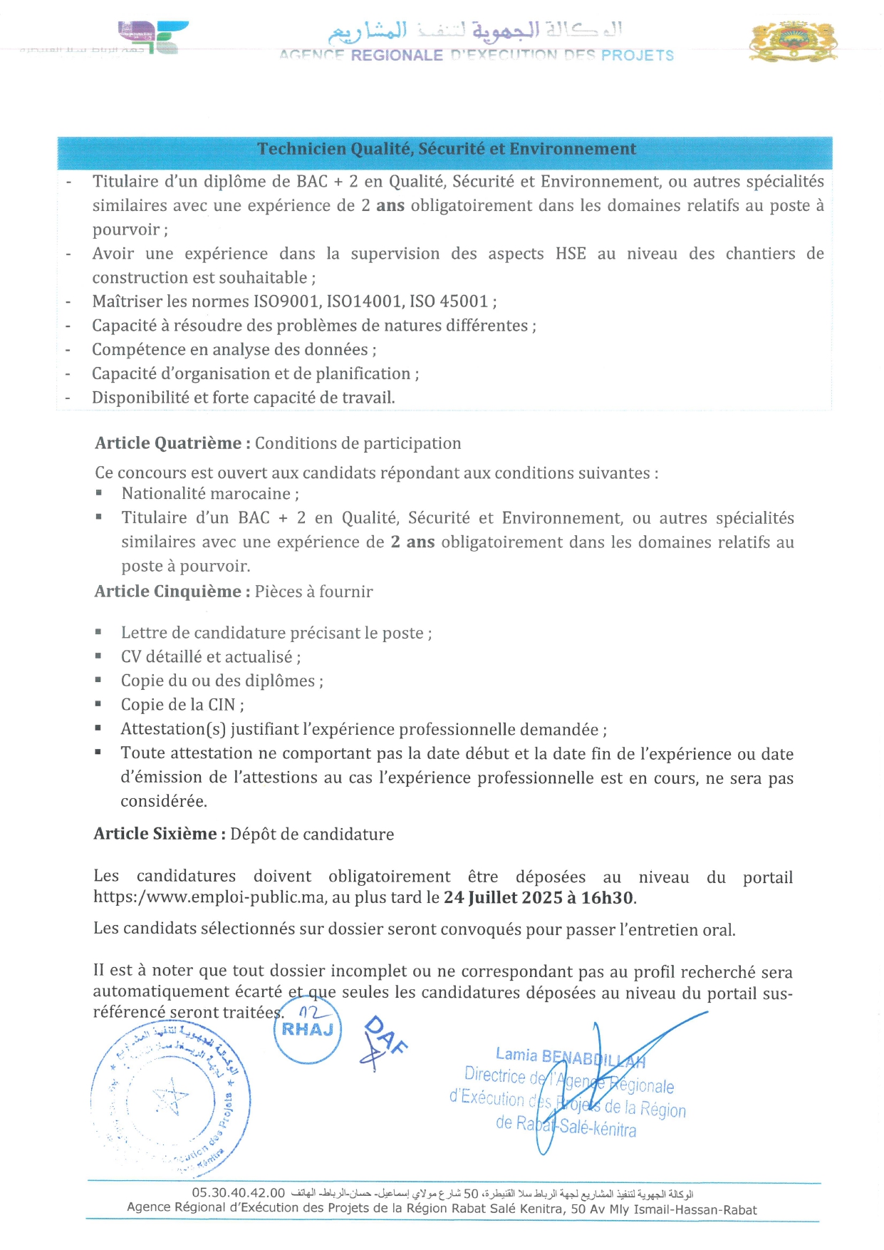 L’Agence Régionale d’Exécution des Projets de la Région Rabat-Salé-Kénitra recrute un Technicien Chargé de la Qualité, Sécurité et Environnement (QSE) pour superviser les chantiers de construction.