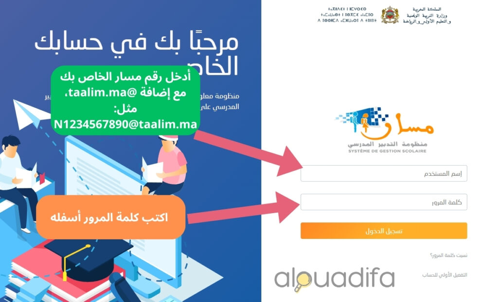 افتح الموقع التالي: https://moutamadris.men.gov.ma/moutamadris/Account في خانة إسم المستخدم، يجب كتابة البريد الإلكتروني الذي يتكون من كود مسار (Code Massar) وإضافة @taalim.ma، مثل: N1234567890@taalim.ma. ثم أدخل كلمة المرور الموجودة في الورقة المطبوعه واضغط على زر تسجيل الدخول.